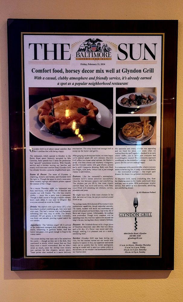 Introducing Glyndon Grill, a charming restaurant located at 4844 Butler Rd in Glyndon, MD. This establishment offers a diverse menu consisting of American cuisine, salads, and seafood dishes. Some notable highlights from their menu include Coconut Shrimp, Short Rib Quesadilla, and the Crab Flatbread. For starters, they offer Blue Crab & Roasted Corn Soup, Kale Salad, and the Glyndon House Salad. The Big Salads section features unique options like the Mango & Mandarin Salad and the Roasted Beet & Goat Cheese Salad. Customer reviews praise the attentive service, flavorful dishes, and cozy ambiance of Glyndon Grill. Whether you're looking for a casual meal, a special occasion dinner, or a spot for happy hour, Glyndon Grill has something for everyone to enjoy. Don't miss out on the homemade desserts and popular dishes like the crab cakes and French dip. This spot is perfect for any dining occasion, from brunch to date night. Visit Glyndon Grill for a memorable dining experience.